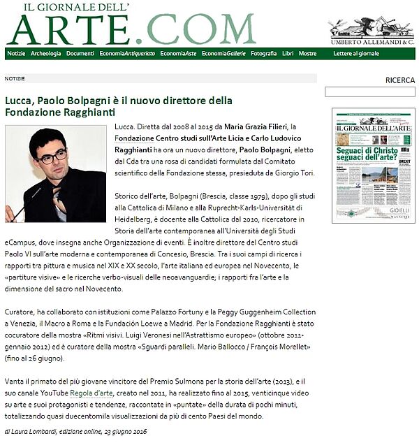 Nomina del prof. Paolo Bolpagni a Direttore della Fondazione Ragghianti di Lucca, istituzione culturale che opera nel campo degli studi e dell'attività espositiva inerenti all'arte contemporanea.
