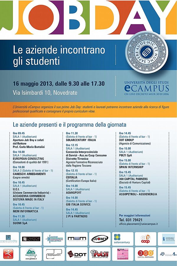 Il 16 maggio 2013 l’Università eCampus organizza il suo primo Job Day, un evento di estrema importanza che consentirà a studenti e laureati di incontrare aziende e strutture alla ricerca di figure professionali qualificate.