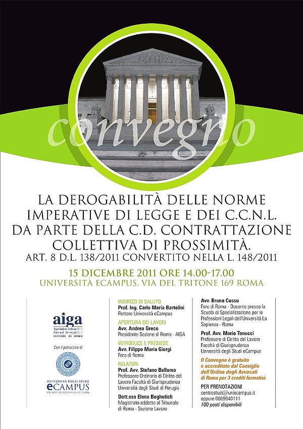Ateneo Eventi La derogabilità delle norme imperative di legge e dei C.C.N.L. da parte della C.D. contrattazione collettiva di prossimità