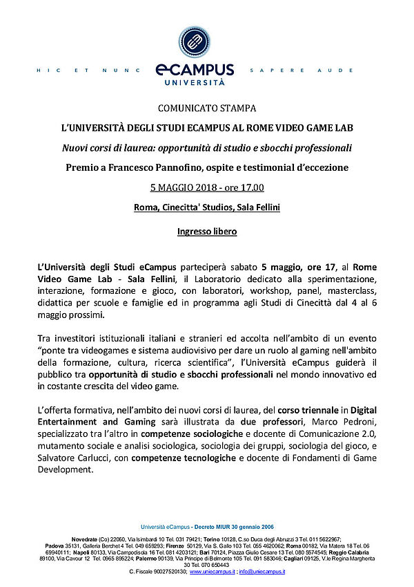 L'UNIVERSITÀ DEGLI STUDI ECAMPUS AL ROME VIDEO GAME LAB