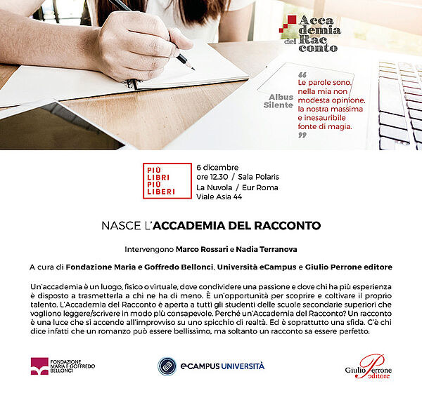 Nell'ambito della Fiera nazionale della piccola e media editoria Più libri più liberi, l'Università eCampus, in collaborazione con Fondazione Maria e Goffredo Bellonci e Giulio Perrone Editore, presenta l'Accademia del Racconto, un'iniziativa dedicata agli studenti delle scuole secondarie di secondo grado.