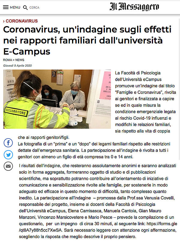IL MESSAGGERO - Coronavirus, un'indagine sugli effetti nei rapporti familiari dall'università eCampus